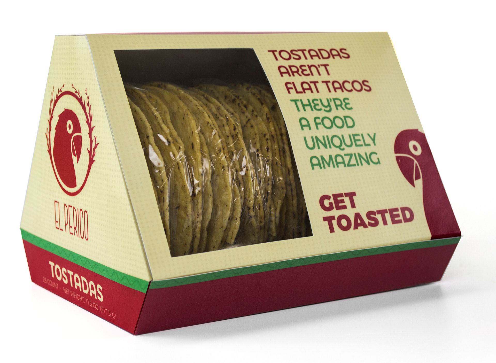 This project entailed re-branding the existing Los Pericos brand as well as designing and producing creative and functional packaging. The purpose of the re-branding is to expand the market for Los Pericos tostadas beyond its regional and Hispanic community markets. All packaging functionality created with cuts, scores and folds is custom designed and physically built by hand for an accurate prototype level piece.