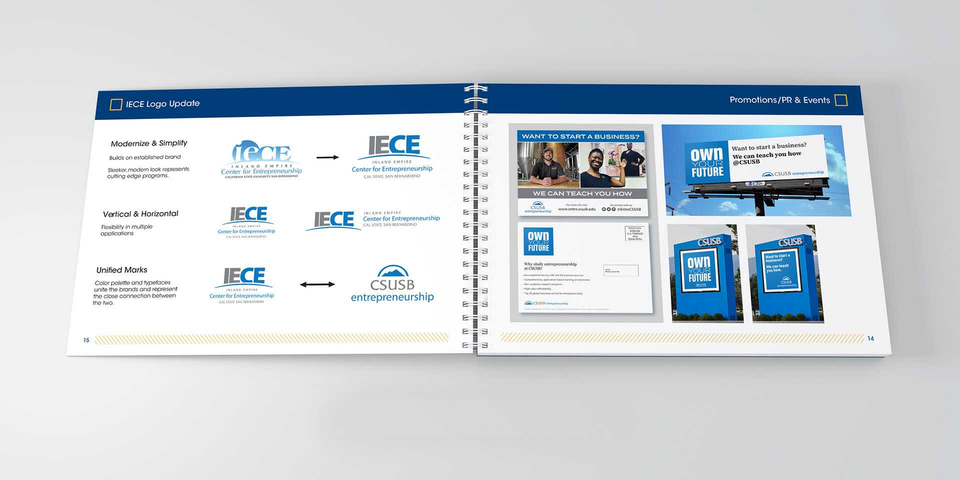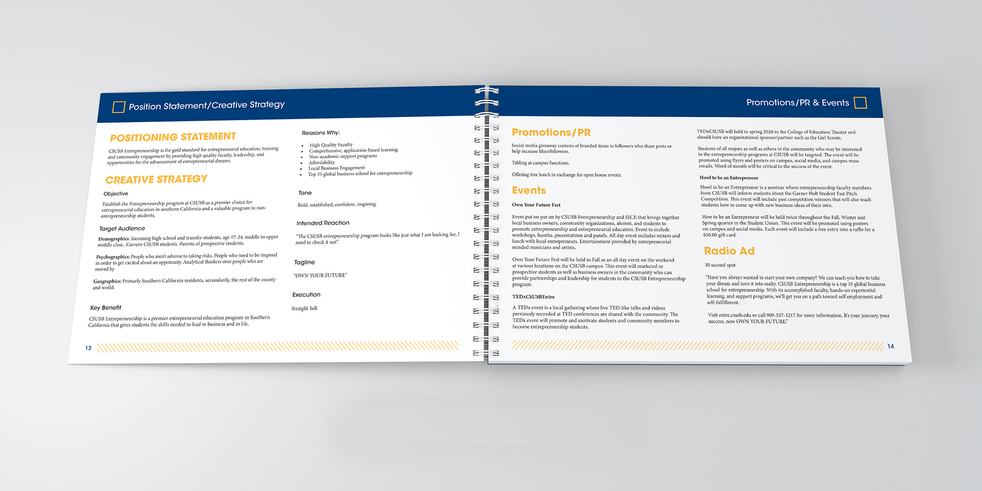 As a group project, teams were tasked with creating an integrated marketing communication plan for CSUSB Entrepreneurship/Inland Empire Center for Entrepreneurship. After developing comprehensive IMC plans, 5 groups would make live pitches to the organization’s representatives and one group would be selected as the winner of a scholarship. I was tasked with developing the creative executions for the marketing plan and designing the physical plan book.